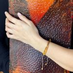 Διπλό βραχιόλι από άριστης ποιότητας πολυγωνικούς αχάτες σε αποχρώσεις του κίτρινου με χρυσούς αιματίτες σε σχήμα κύβου. Στο μέσο του βραχιολιού υπάρχει ατσάλινο στοιχείο διάτρητο ορθωγόνια σαν ταυτότητα χρυσό. Το βραχιόλι κλείνει με μακραμέ