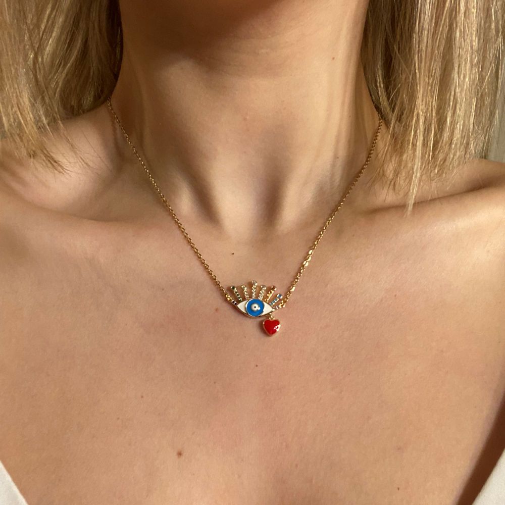 Κολιέ ατσάλινη χρυσή αλυσίδα με μοτίφ ατσάλινο επίχρυσο περίγραμμα τετραγώνου με κόκκινο μάτι στην πάνω πλευρά.