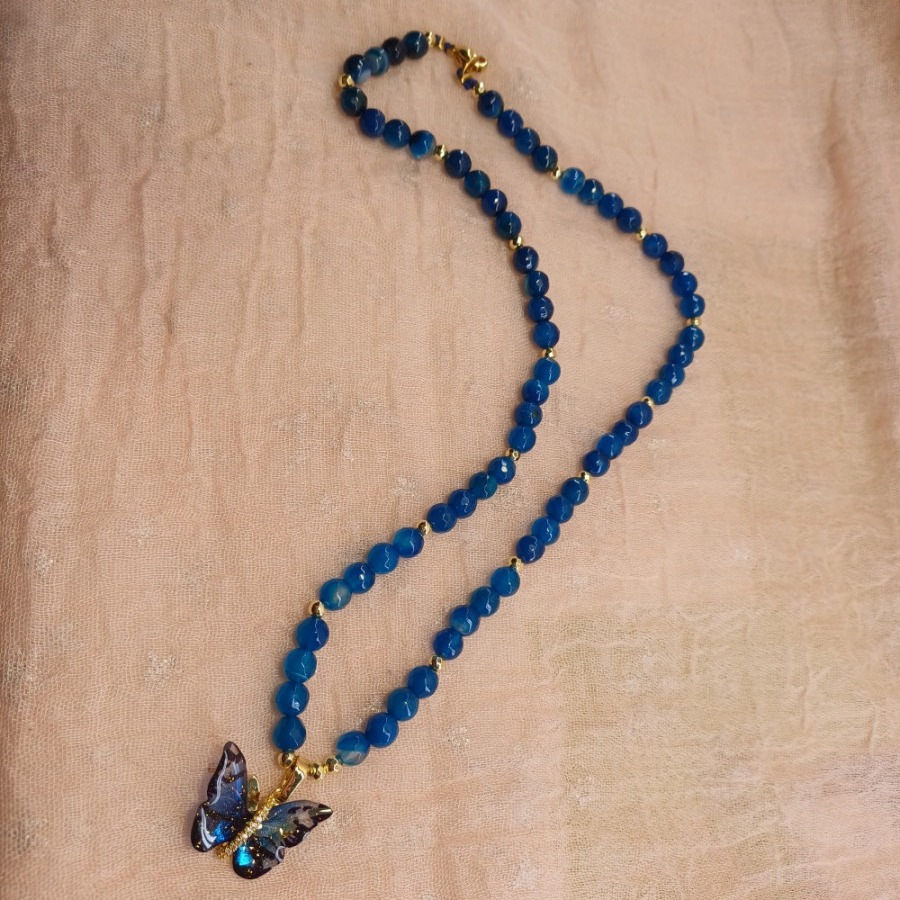 Κολιέ από μπλε αχάτες, επίχρυσους αιματίτες και μοτίφ πεταλούδα.