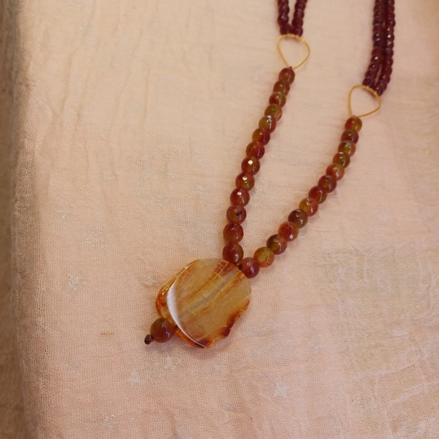 Κολιέ από αχάτες, αιματίτες χρυσούς και μοτίφ μεγάλη πλακέ πέτρα αχάτη.