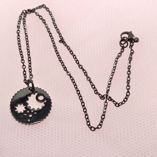 Ιδιαίτερο μαύρο κολιέ! Αποτελείται από κλασική μαύρη ατσάλινη αλυσίδα με μικρούς οβάλ κρίκους και μοτίφ ατσάλινο μαύρο με σχήμα γρανάζι. Μήκος 40 cm. Μπορεί να γίνει μεγαλύτερο ή μικρότερο.