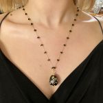 Μακρύ κολιέ από ροζ aria ατσάλινο ροζάριο με ημιπολύτιμες μαύρες πέτρες και μοοτίφ επιχρυσο, με μαύρη επισμάλτωση και χρυσά σχήματα. Μήκος 72 εκ.
