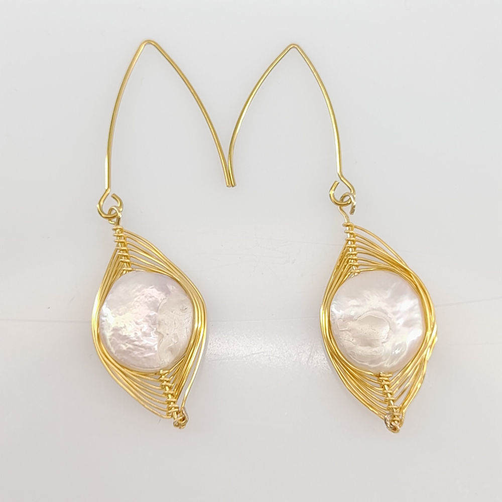 Ατσάλινα χρυσά σκουλαρίκια γάντζοι με επίχρυσο 18 Κ μοτίφ με στρογγυλό πλακέ μαργαριτάρι.