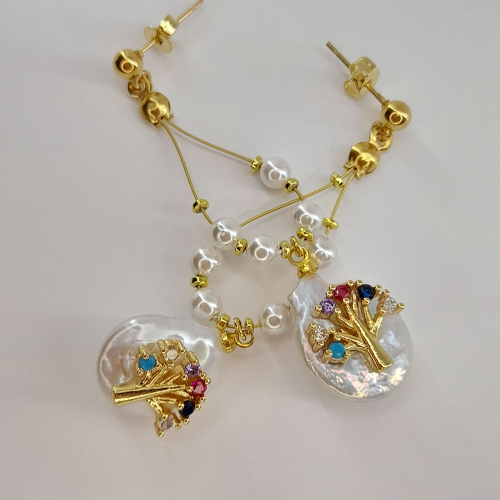 Ατσάλινα χρυσά σκουλαρίκια με ημιπολύτιμες πέτρες, και μαργαριτάρι με επίχρυσο δέντρο ζωής.