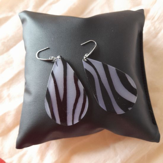 Απλά αλλά κομψά και ευκολοφόρετα κρεμαστά σκουλαρίκια. Το τμήμα που βρίσκεται πάνω στο αυτί είναι ατσάλινο σε σχήμα σταγόνας. Κάτω από αυτό κρέμεται plexi στοιχείο σχήματος δάκρυ με animal print σχέδιο, σε χρώμα άσπρο μαύρο. Μήκος 7,5 εκ.